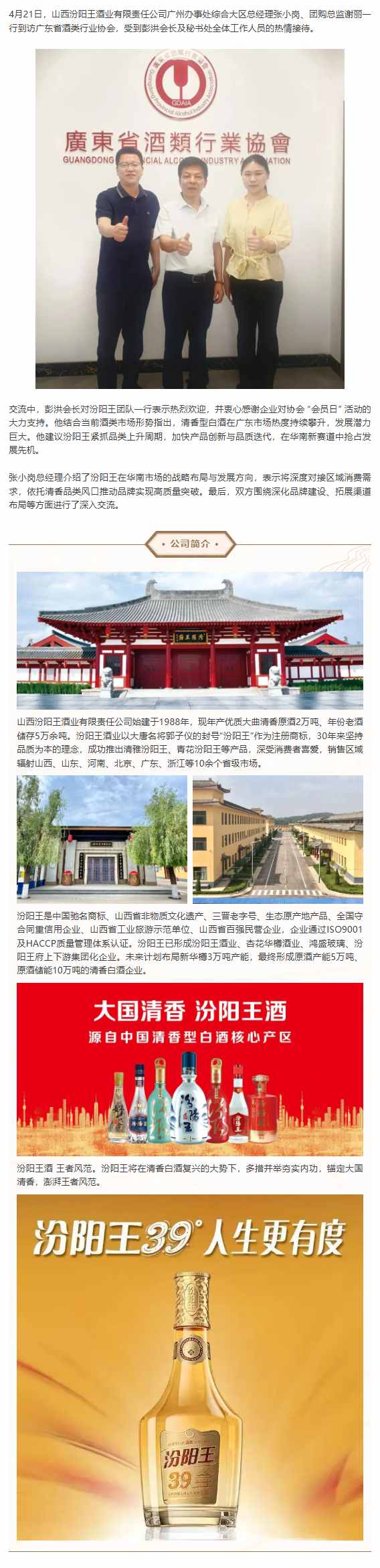 山西汾阳王酒业广州办事处综合大区总经理 张小岗 一行到访广东省酒协