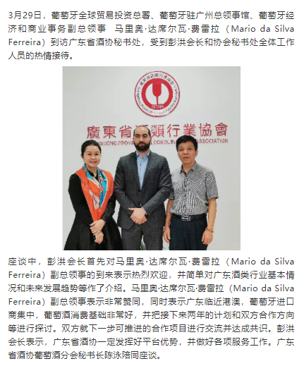 葡萄牙经济和商业事务副总领事马里奥·达席尔瓦·费雷拉(Mario da Silva Ferreira)到访广东省酒协