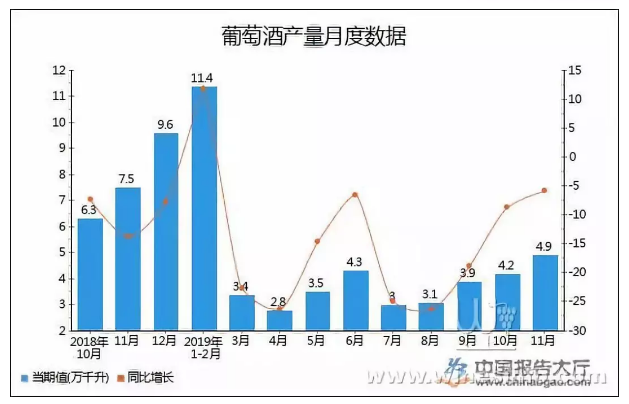 根据中国报告大厅对2019年1-11月全国葡萄酒产量进行监测统计显示:2019年11月全国葡萄酒产量4.9万千升,同比下降5.8%,2019年1-11月全国葡萄酒产量为37.2万千升,累计下降12.1%。