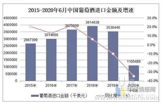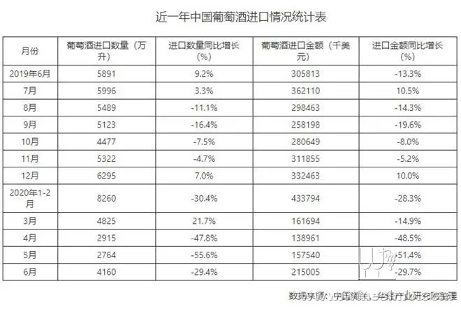 2020年6月中国葡萄酒进口数量为4160万升,同比下降29.4%;进口金额为215005千美元,同比下降29.7%。