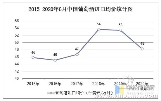 华经产业研究院数据显示:2020年1-6月中国葡萄酒进口数量为22909万升,相比上年同期减少了10638.1万升,降幅为31.7%;进口金额为1105486千美元,相比上年同期减少了588716千美元,降幅为34.8%;2020年1-6月中国葡萄酒进口均价为48.26千美元/万升。