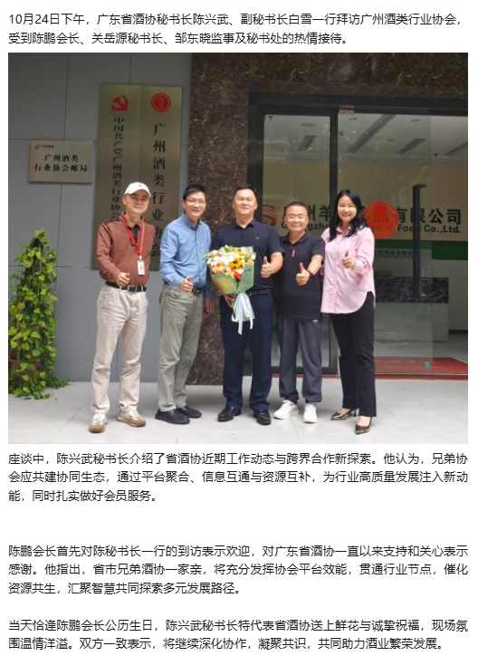 贵州省习水县委书记冉崇庆到访广东省酒类行业协会开展招商考察